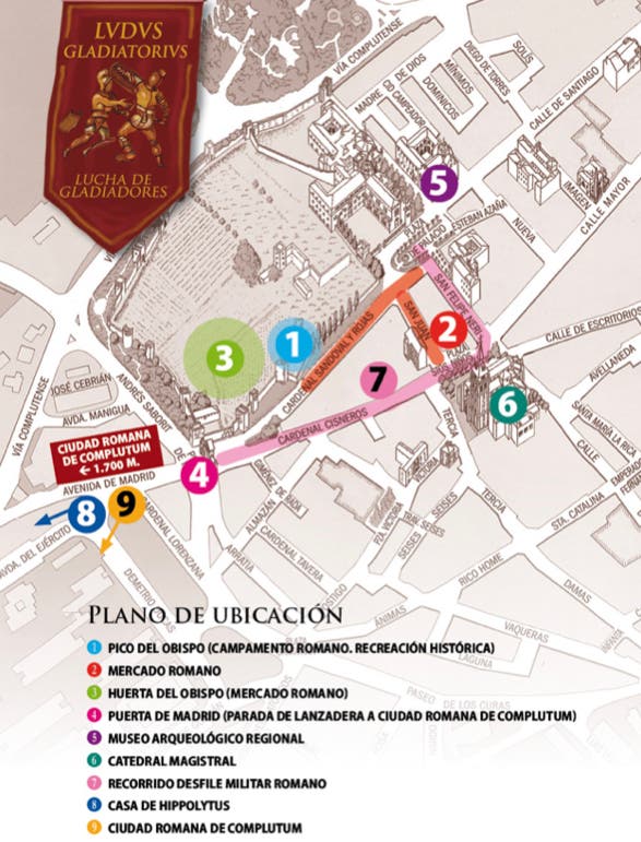 Las calles adyacentes acogerán los puestos del mercado romano. Además, se han organizado visitas guiadas teatralizadas al Yacimiento Romano de Complutum, que se conectará con el centro de la ciudad con un autobús lanzadera. Además el público podrá disfrutar de desfiles militares romanos.