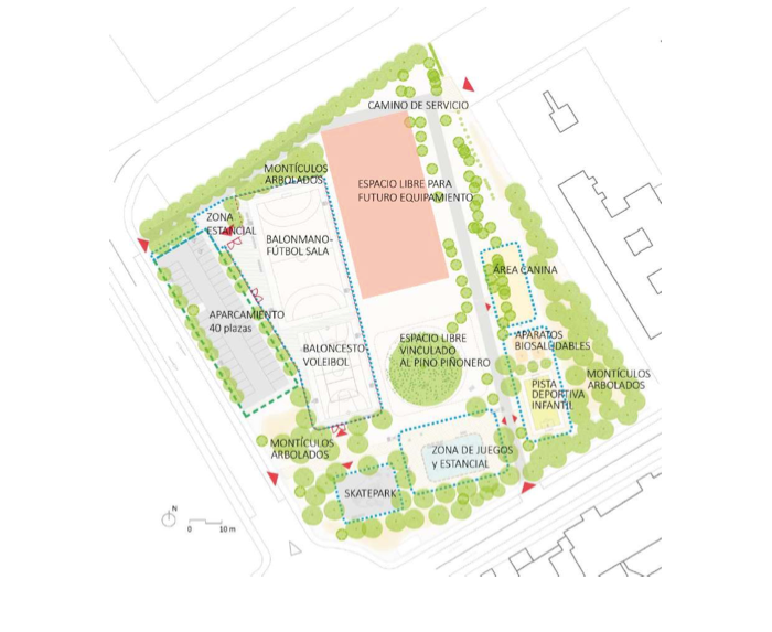 Además, incluyen la construcción de una pista multideporte o baby-deporte para niños de hasta 10 años; una nueva zona de skate park para menores de 14 años; la disposición de accesos peatonales y nuevas zonas verdes; la creación de zonas de actividades y juegos para los diferentes colectivos y grupos de edad; y una nueva zona canina con papeleras para residuos caninos y una fuente mixta con cartel informativo.