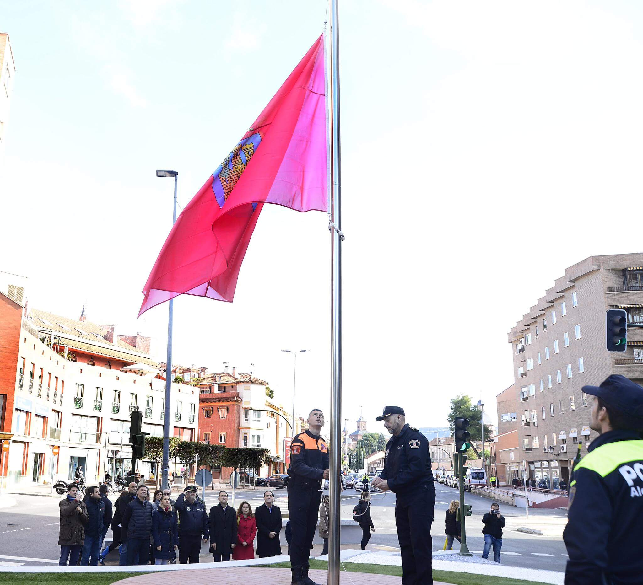 Esta pasado jueves ha tenido lugar el acto de izado de una gran bandera de Alcalá de Henares por parte de miembros de la Policía Local y de Protección Civil en la confluencia de la Vía Complutense, con las calles Diego de Torres y Luis Astrana Marín, junto a la Plaza de la Cruz Verde.