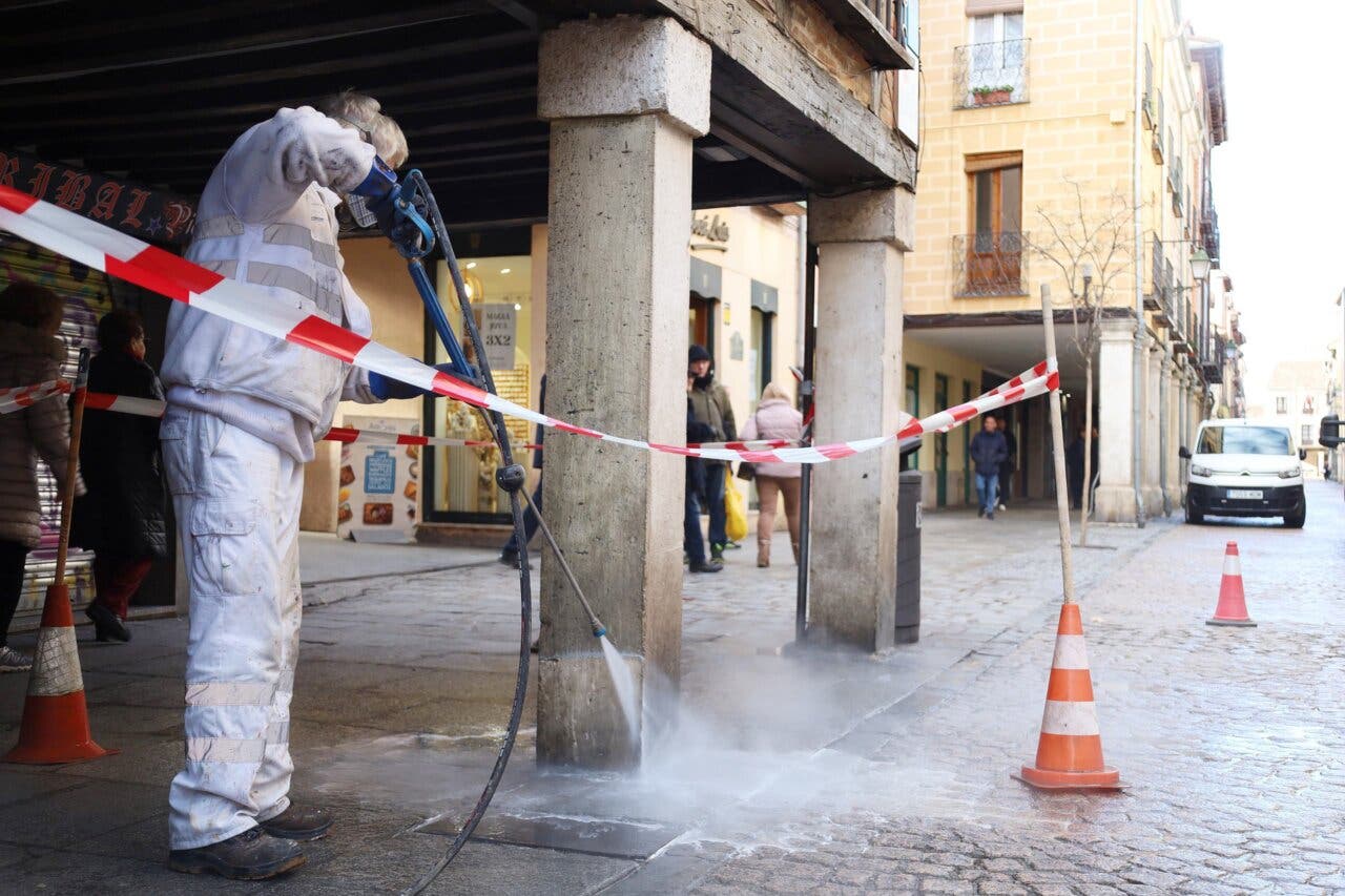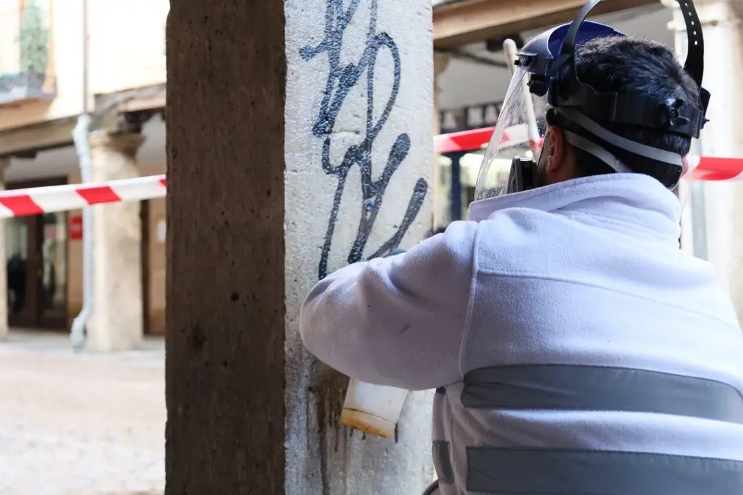 El concejal de Medio Ambiente, Limpieza y Patrimonio Histórico, Vicente Pérez, ha visitado esta mañana las tareas de limpieza de algunas de las pintadas que se han realizado en el centro histórico, en lugares tan emblemáticos como las columnas de la calle Mayor.