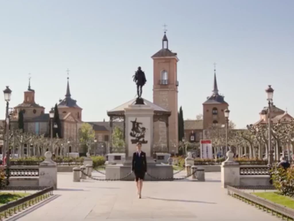 El vídeo comienza con imágenes de una azafata recorriendo los principales puntos turísticos de la Comunidad de Madrid, entre ellos la Plaza de Cervantes, en Alcalá de Henares.