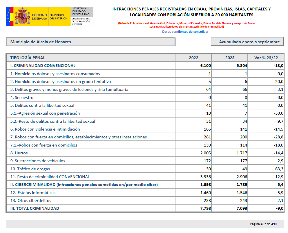 Alcalá de Henares es la ciudad que más reduce la criminalidad en la Comunidad de Madrid según el balance de criminalidad de enero a septiembre de 2023 publicado por la Secretaría de Estado de Seguridad del Ministerio del Interior del Gobierno de España.