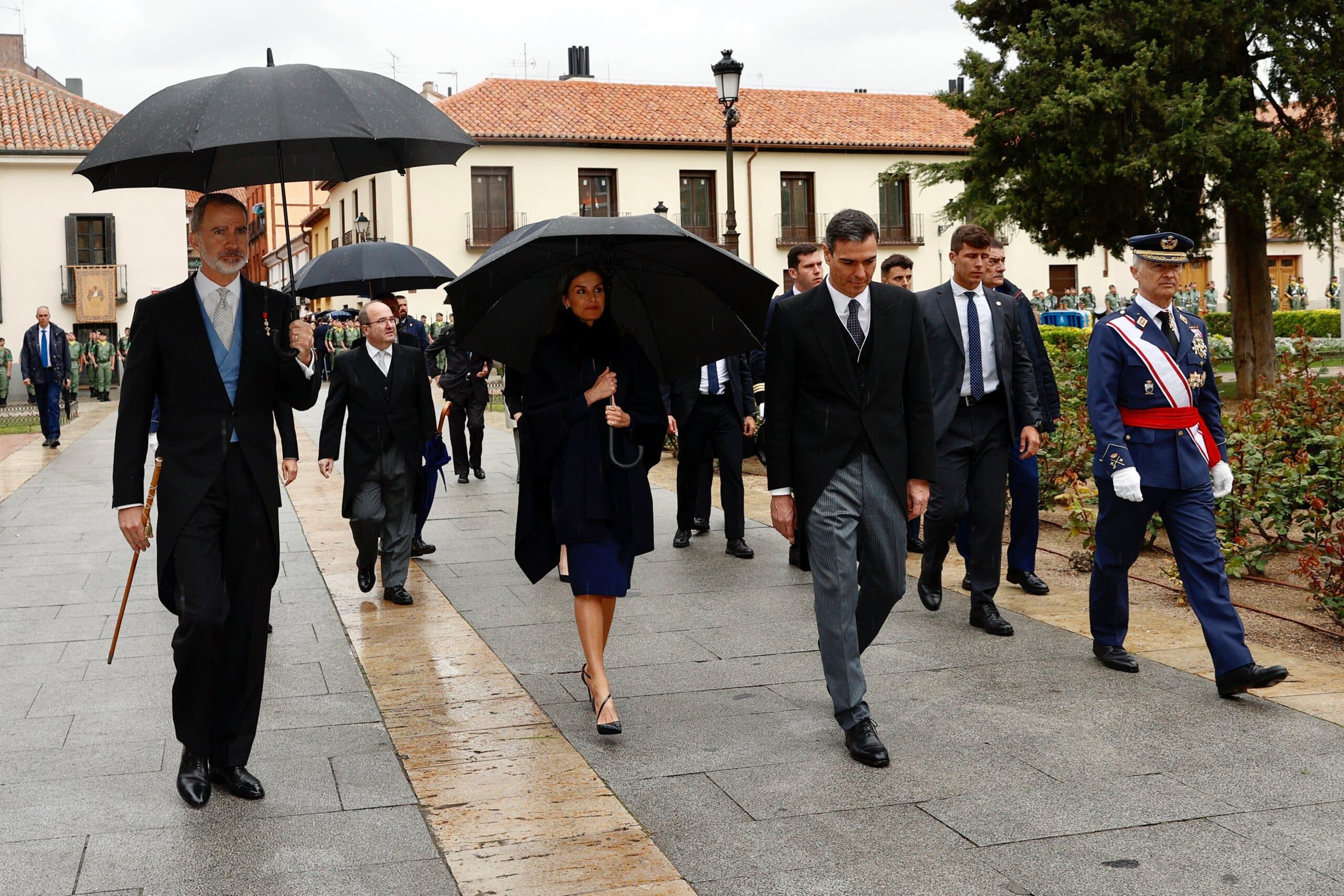 A su llegada a la Universidad de Alcalá, don Felipe y doña Letizia han sido recibidos por el presidente del Gobierno, Pedro Sánchez y por el general jefe del Mando Aéreo General, Juan Ángel Treceño. A continuación, el Rey ha pasado revista a una Compañía de Honores y seguidamente, ya junto a la Reina, han recibido el saludo de varias autoridades.