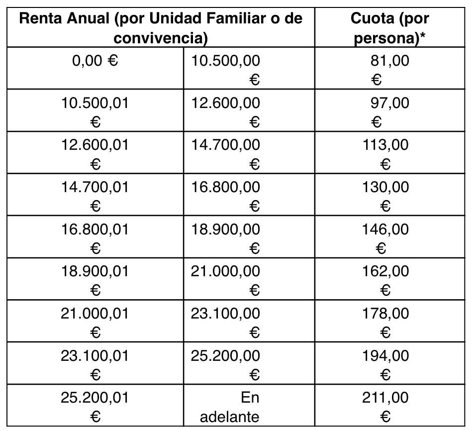 Los participantes abonarán en la agencia de viajes, de forma individual, a través de pago con tarjeta o en efectivo, la cuantía que les corresponda según el nivel de ingresos de la unidad familiar o de convivencia, de acuerdo con la siguiente tabla: