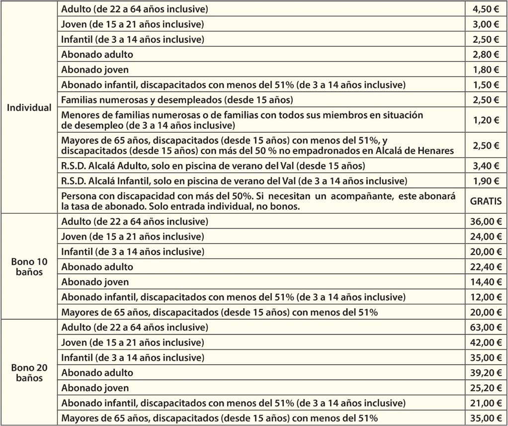 Los precios se mantienen y existe la opción de comprar bonos de 10 y de 20 baños. Además se efectuarán descuentos para titulares del Carnet Descuento de la Ciudad Deportiva, personas mayores de 65 años, desempleados, personas con discapacidad y sus acompañantes y familias numerosas. Para los abonados Multideporte Alcalá con la modalidad de general, el acceso seguirá siendo gratuito.