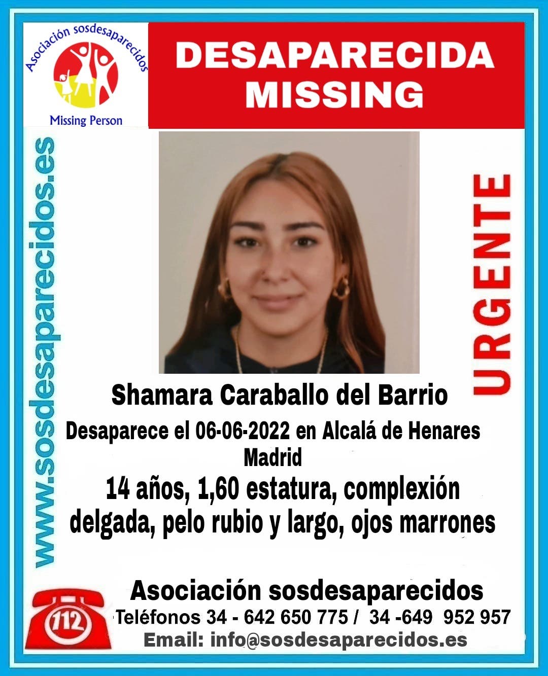 La Asociación SOS Desaparecidos ha difundido una alerta por la desaparición de una joven de 14 años el pasado 6 de junio en Alcalá de Henares, por lo que lleva seis días en paradero desconocido.