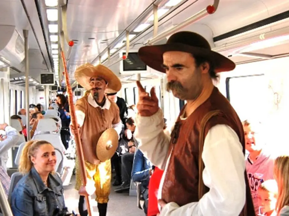 A bordo del tren, que sale de Atocha a las 10.35, viaja junto a los pasajeros un elenco de actores que dan vida a personajes del Quijote y representan pasajes cervantinos para amenizar el viaje.