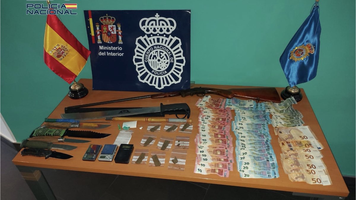 Entre los efectos intervenidos, los agentes encontraron cerca de 1.900 euros en efectivo, un arma de fuego, varias armas blancas prohibidas de grandes dimensiones, diferentes dosis de hachís, cocaína y marihuana preparadas para su venta, así como básculas de precisión.