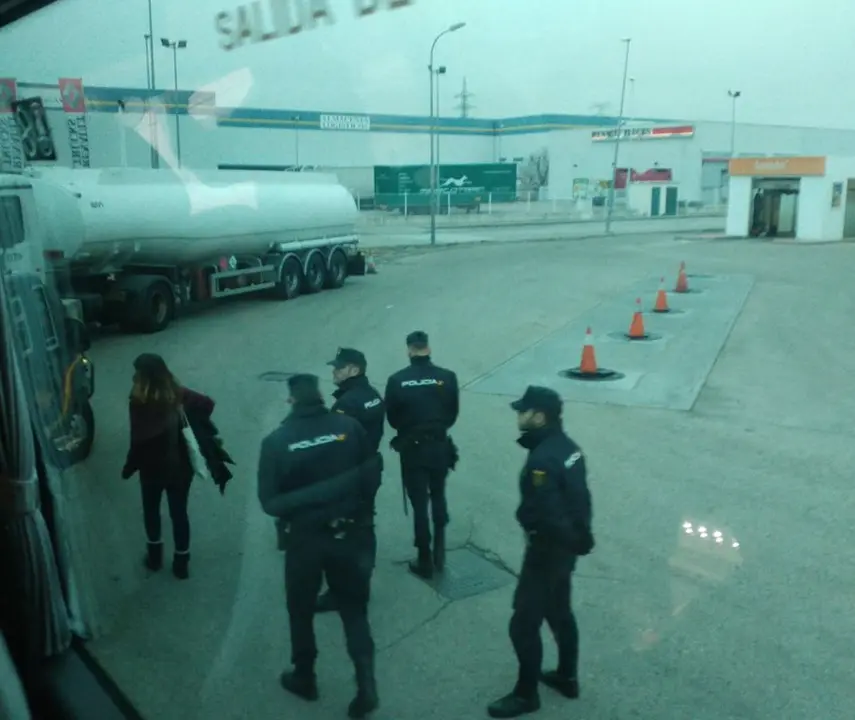 Tres furgonetas de la Policía han obligado al vehículo en el que viajaban a desviarse a una gasolinera de Alcalá de Henares. Una vez parados, los agentes han hecho bajarse del autocar a los pasajeros uno a uno para identificarlos y cachearlos, según ha explicado la CUP.