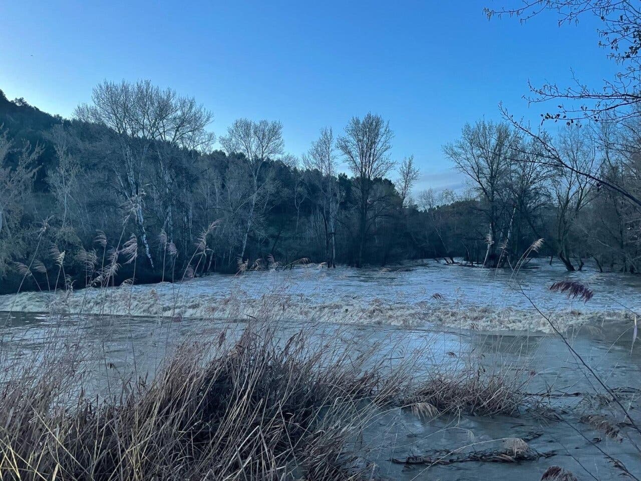 El Ayuntamiento de Alcalá de Henares ha informado este domingo que el caudal del río Henares ha alcanzado el nivel rojo, debido al incremento del flujo de agua tras la apertura del embalse de Beleña y las lluvias acumuladas en las últimas horas.