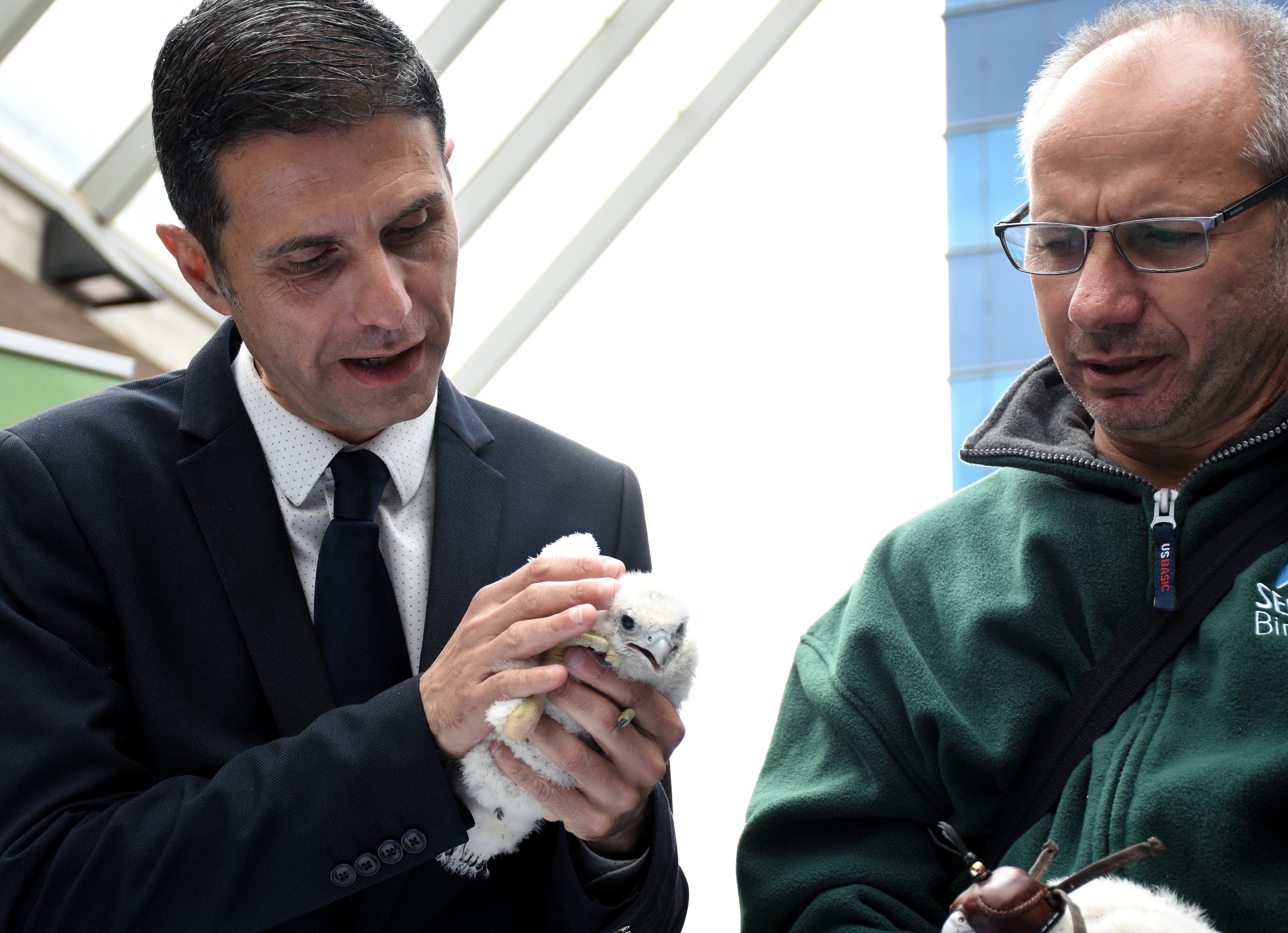 Esta viernes se ha procedido al anillado de los nuevos pollos, cuyo nido se ubica en el edificio Torre Garena. Al acto han acudido el alcalde, Javier Rodríguez Palacios, y el concejal de Medio Ambiente, Alberto Egido.