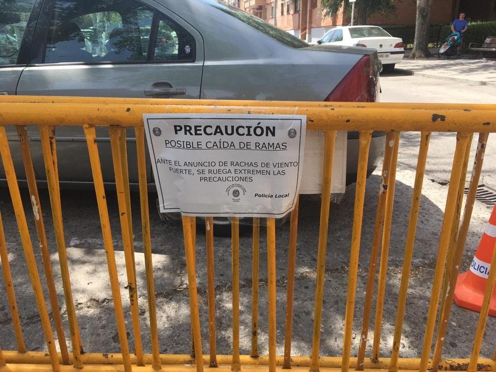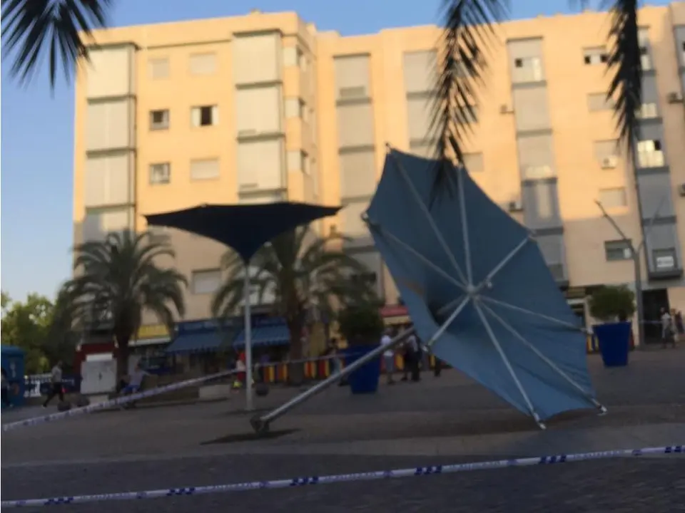 En Torrejón, el viento, sobre las dos de la madrugada, tumbó una sombrilla de la Plaza de España, que ha amanecido este miércoles acordonada por la Policía Local hasta que ha sido retirada para su reparación.
