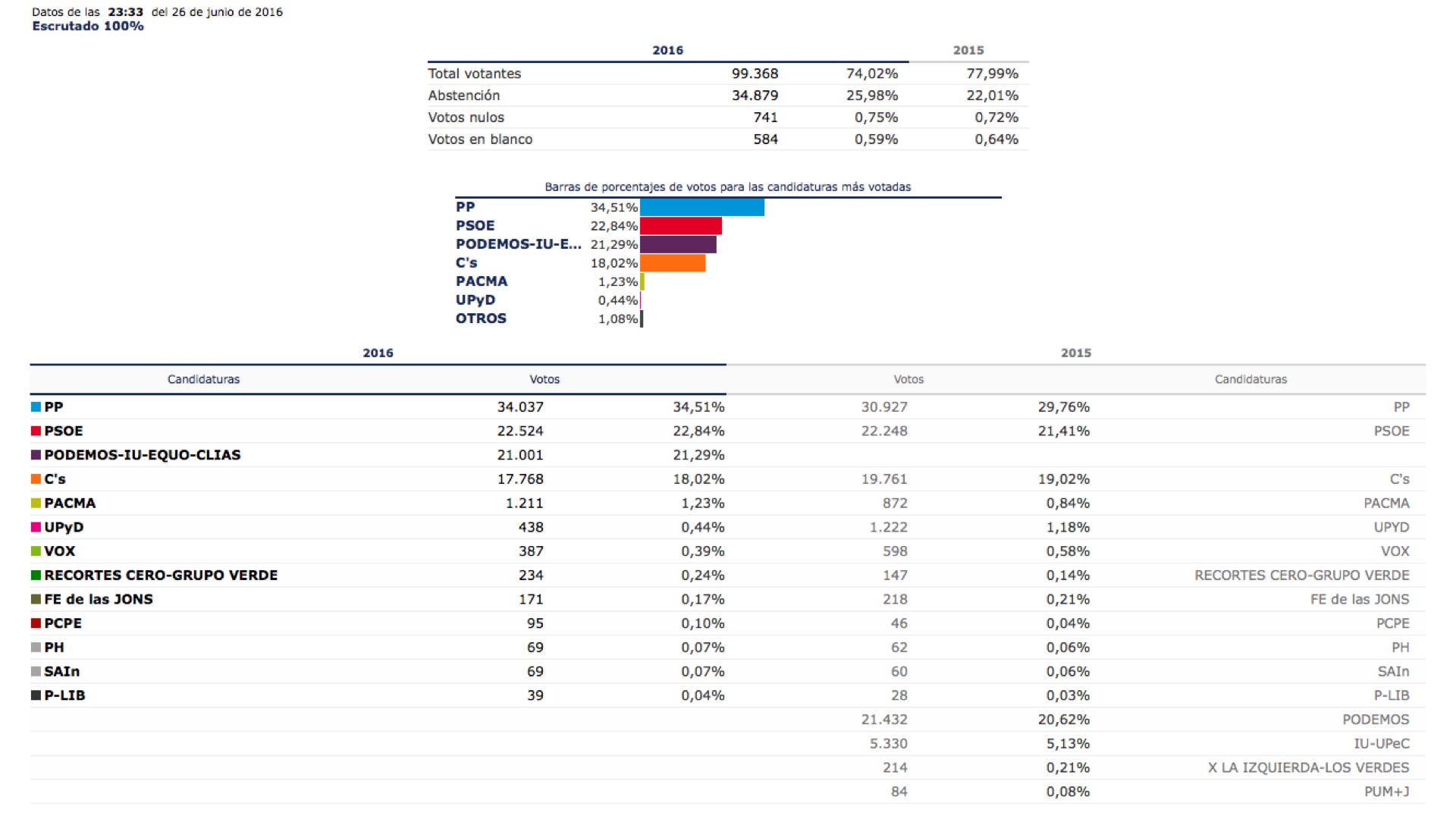 Aumenta sus apoyos el PP con respecto a los comicios de 2015, en los que obtuvo un porcentaje del 29,76%. El PSOE también sube respecto a 2015 cuando consiguió un porcentaje del 21,41%. Cae Podemos que en las pasadas elecciones se llevó más del 25% de los sufragios si sumamos los votos de Podemos e Izquierda Unida frente al 21,29% conseguido en estos comicios del 26J. Ciudadanos también baja, lo hace dos puntos. Y sube el PACMA, el partido animalista, que alcanza en estas elecciones 1.211 votos frente a los 872 conseguidos en 2015.