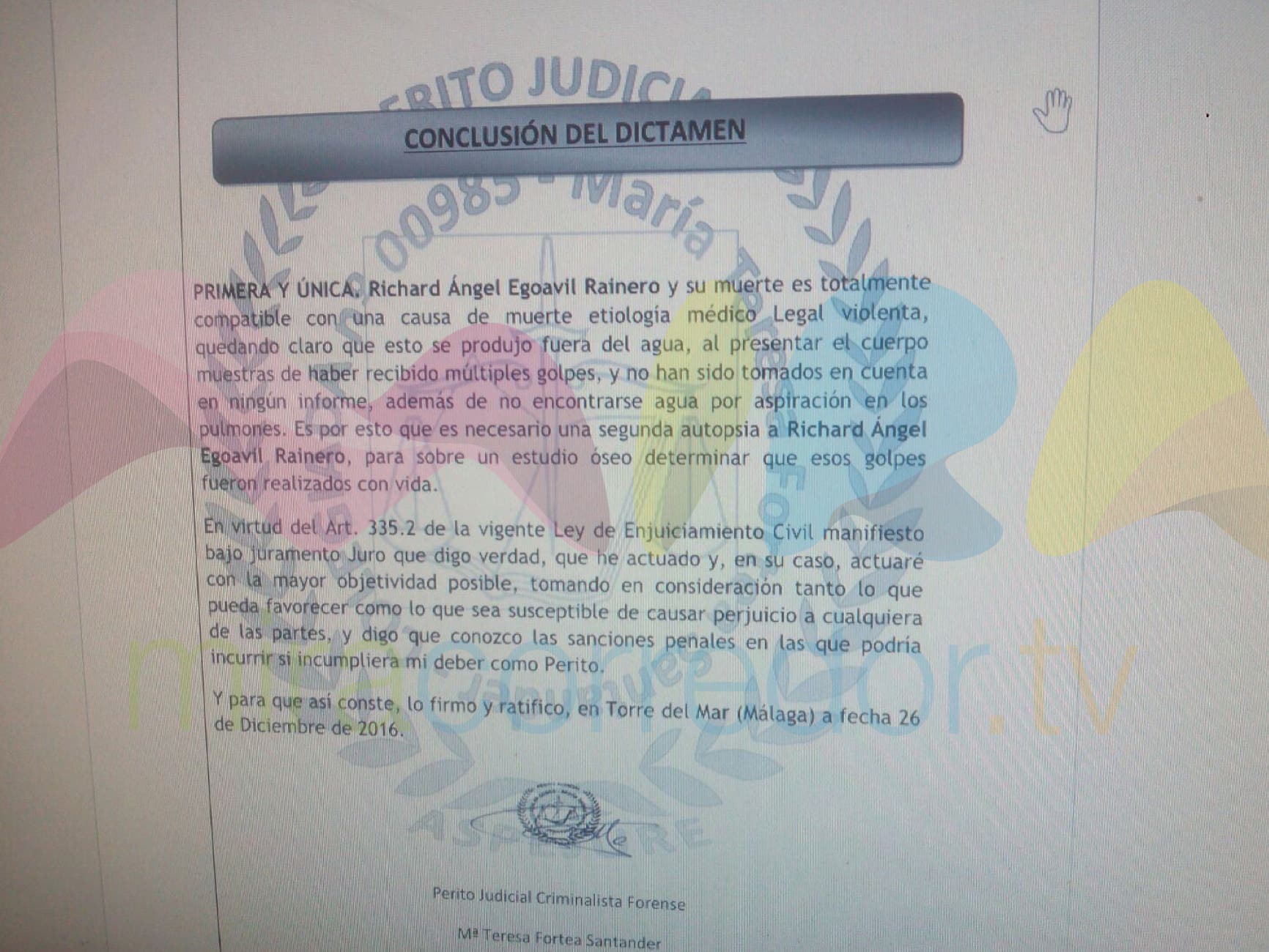 Un nuevo informe de más de 25 páginas realizado por la perito judicial criminalista forense María Teresa Fortea Santander, y al que ha tenido acceso MiraCorredor.tv en exclusiva, concluye que «su muerte es totalmente compatible con una causa de muerte violenta, quedando claro que esto se produjo fuera del agua, al presentar el cuerpo muestras de haber recibido múltiples golpes, y no han sido tomados en cuenta en ningún informe, además de no encontrarse agua por aspiración en los pulmones».