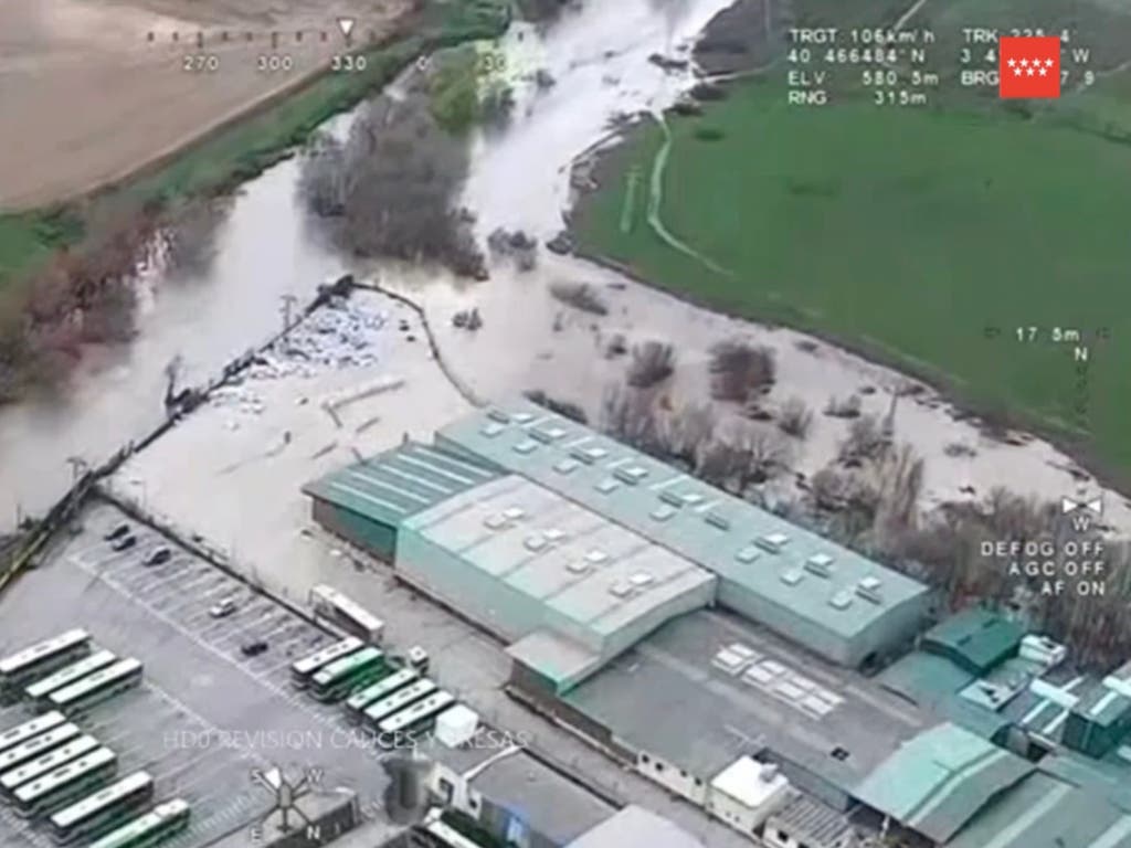 Los Bomberos de la Comunidad de Madrid han captado este miércoles imágenes aéreas del estado actual de los ríos Henares y Jarama, en nivel rojo por la crecida de sus caudales debido a las últimas lluvias y a los desembalses que se están llevando a cabo.