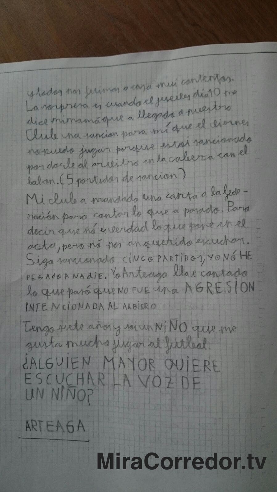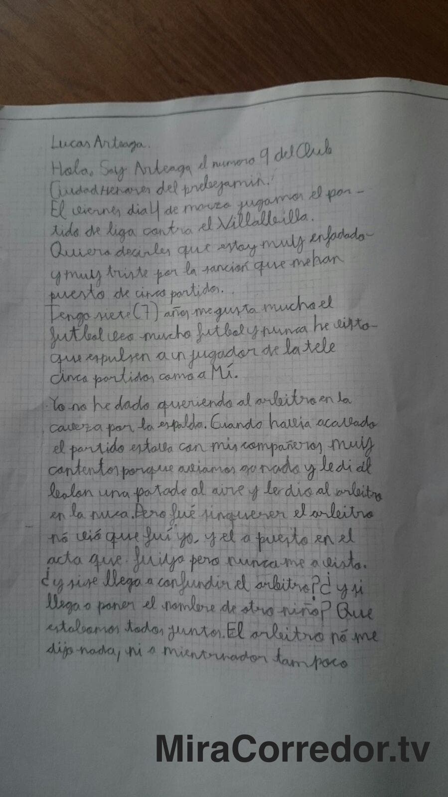 Una emotiva carta que queremos compartir contigo con voz y rostro de su protagonista, Lucas Arteaga, el niño de 7 años sancionado por la Federación de Fútbol de Madrid sin poder jugar 5 partidos por darle un balonazo al árbitro. Según explica el pequeño en su carta, fue sin querer, se encontraba celebrando un gol de su equipo, Ciudad del Henares de Alcalá de Henares, y lanzó el balón al aire con tan mala suerte que cayó sobre la cabeza del árbitro.