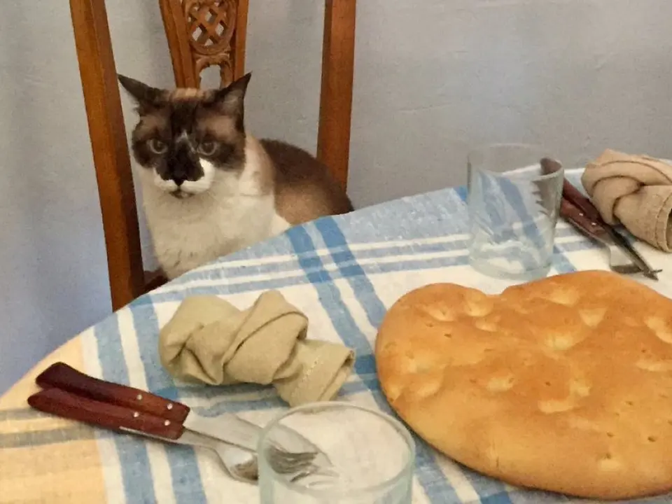 El minino, marrón y blanco, posa a mesa puesta.