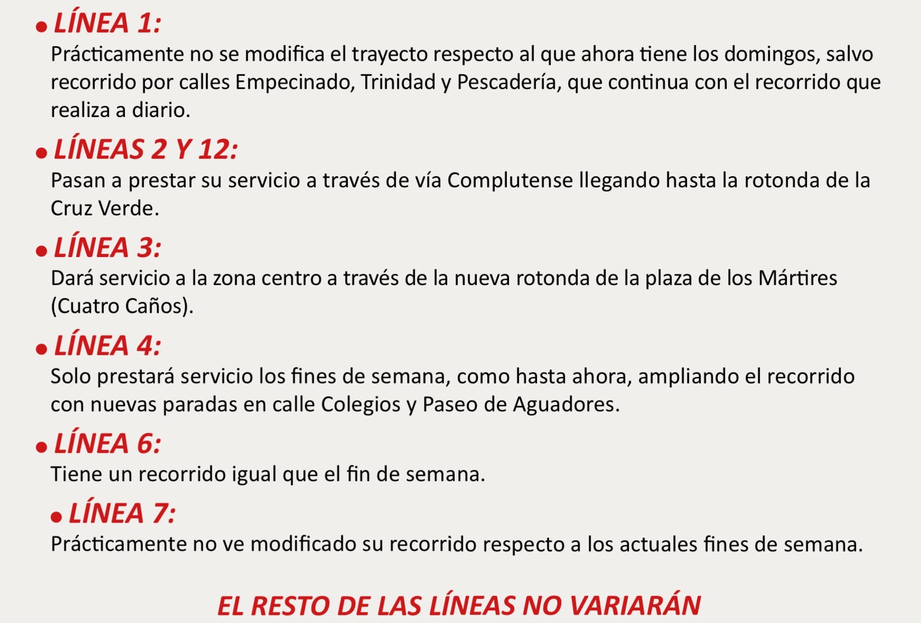 Los nuevos trayectos serán similares a los que funcionan los domingos en la actualidad, pero con pequeñas modificaciones y mejoras para todos los días.