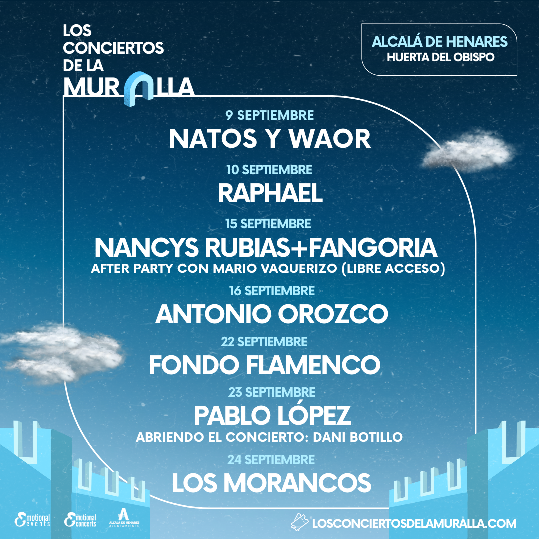 Del 9 al 24 de septiembre, el Recinto Amurallado del Palacio Arzobispal recibirá a Natos y Waor (9 septiembre), Raphael (10 septiembre) Nancys Rubias y Fangoria (15 septiembre), Antonio Orozco (16 septiembre), Fondo Flamenco (22 septiembre), Pablo López (23 septiembre) y Los Morancos (24 septiembre).