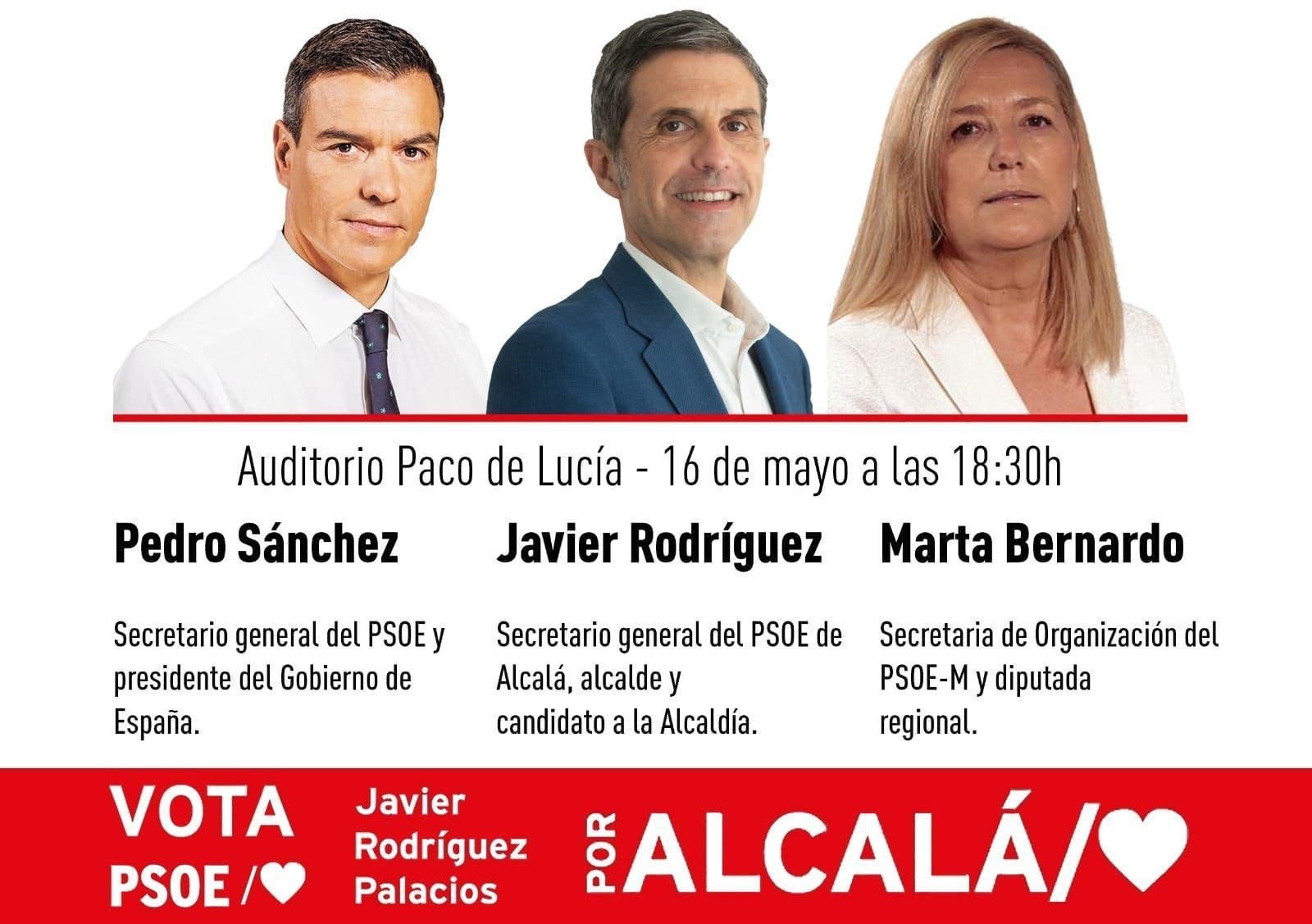 El mitin tendrá lugar, a las 18:30 horas, en el Auditorio Paco de Lucía de la ciudad complutense, Y también intervendrá la secretaria de organización de los socialistas madrileños, Marta Bernardo.