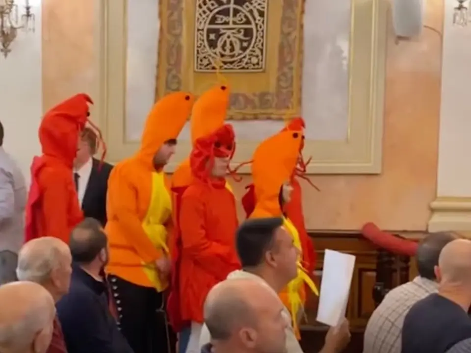 Simpatizantes de Vox disfrazados de mariscos protestan en el Pleno de Alcalá de Henares contra los liberados sindicales