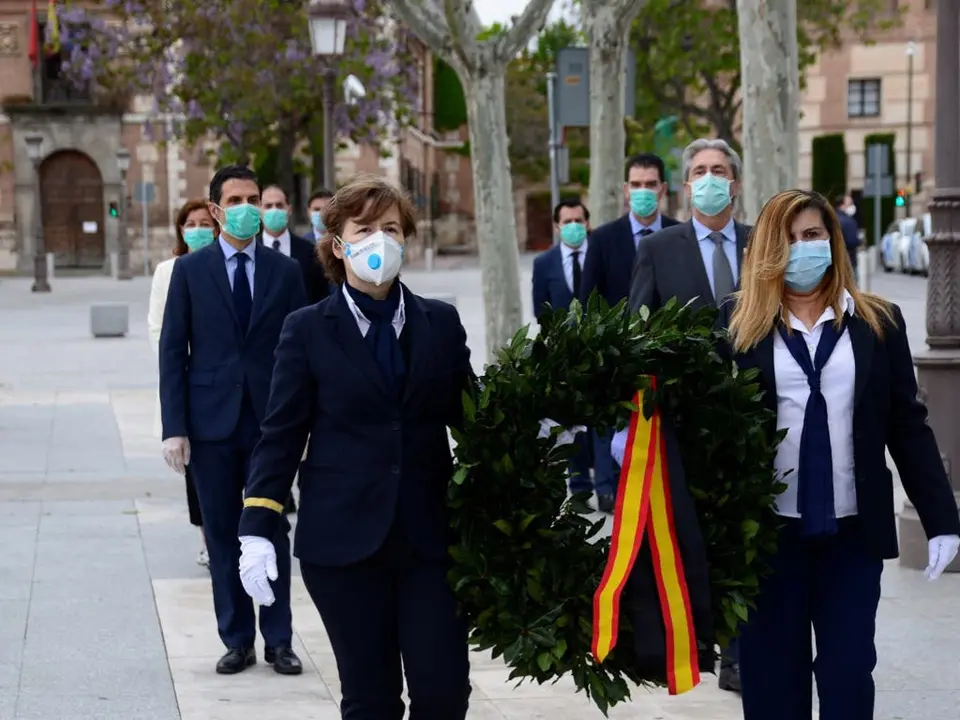 A pesar de que este 23 de abril es diferente a los anteriores, el alcalde, Javier Rodríguez Palacios, el rector de la Universidad y los portavoces de los grupos políticos del Ayuntamiento, todos con guantes y mascarillas, han mantenido la tradición depositando una corona de laureles a los pies de la estatua de Cervantes para conmemorar su muerte, y han guardado un minuto de silencio por los fallecidos por el coronavirus.