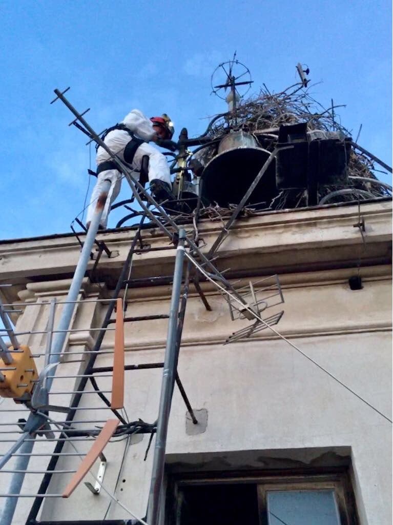 Los Bomberos de la Comunidad de Madrid tuvieron que subir ayer viernes, a última hora de la tarde, a la torre del Ayuntamiento de Alcalá de Henares para auxiliar a un polluelo de cigüeña que se encontraba en peligro, según ha informado el 112 de la Comunidad de Madrid.