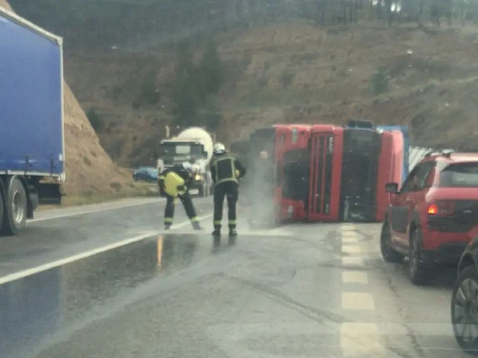 El tráiler, por causas que están siendo investigadas, ha quedado volcado lateralmente, derramando parte del combustible sobre la calzada, lo que ha obligado a cortar la carretera en ambos sentidos.