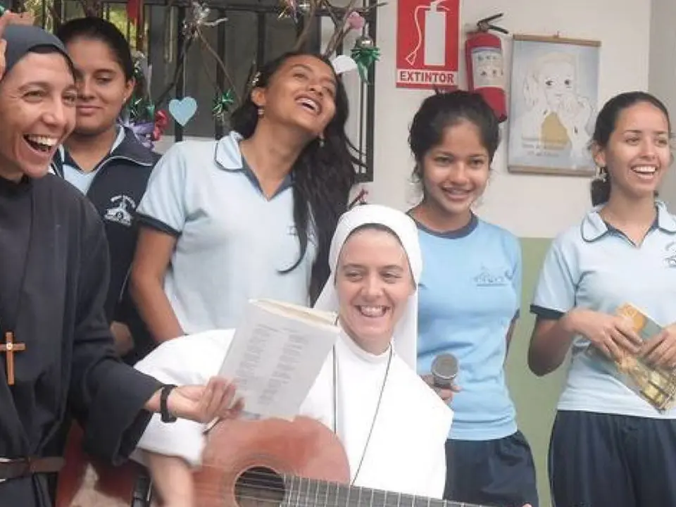 En la foto publicada en el Facebook de la organización Hogar de la Madre aparecen la ya desaparecida hermana Claire tocando la guitarra con el hábito blanco de las Siervas y a su derecha la hermana Estela, superviviente y hermana de sangre de la Superiora de Alcalá, con el hábito oscuro de trabajo que utilizan las Siervas.