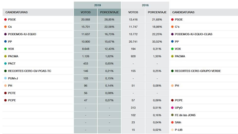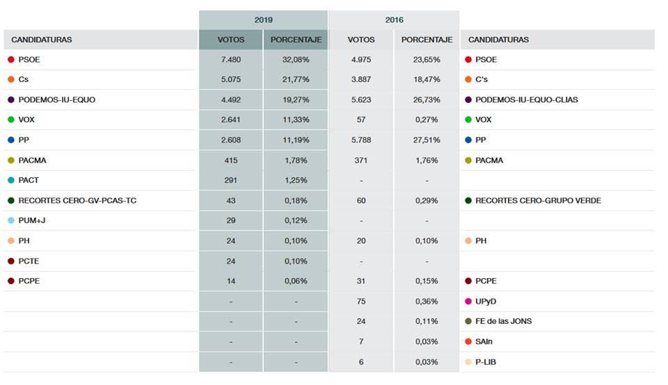 En Azuqueca de Henares, el PSOE lograba el 32,02% de los sufragios, Ciudadanos el 20,10%, Podemos el 15,62%, Vox el 15,59%, y el PP en último lugar se hacía con el 13,44%.