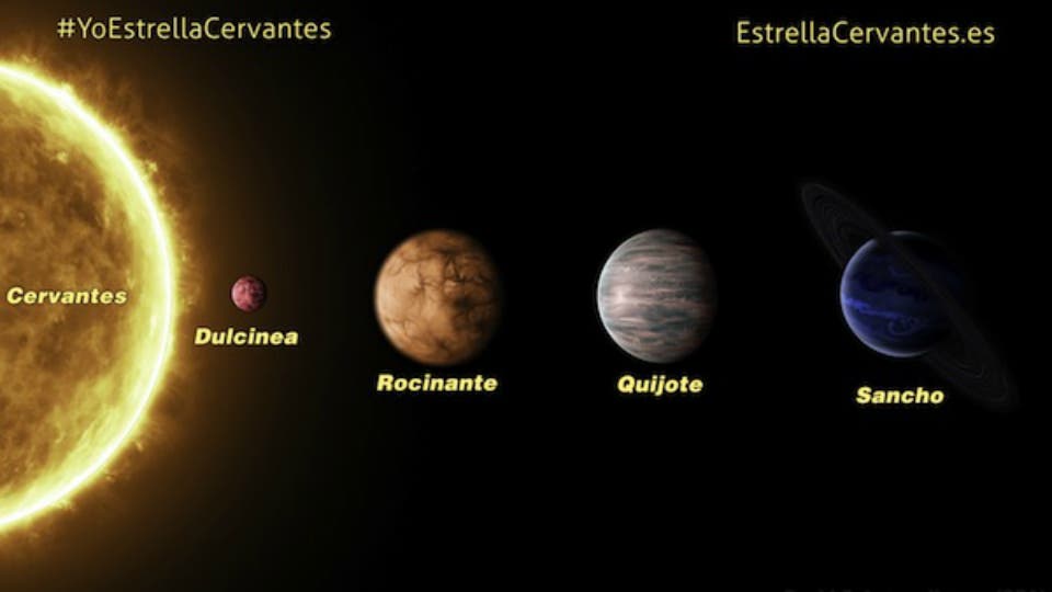 La Unión Astronómica Internacional encargada de asignar nombres oficiales a los objetos celestes, acaba de anunciar esta decisión después de convocar un concurso público para renombrar a los sistemas planetarios hallados en los últimos años. Los cuatro planetas que orbitan a Cervantes serán Quijote, Rocinante, Sancho y Dulcinea.