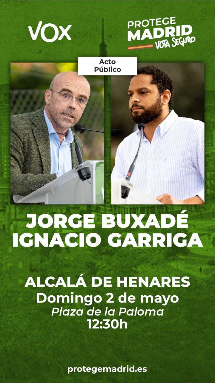 «Además de la utilización partidista de la cuenta oficial de Twitter del Ayuntamiento por parte del PSOE de Alcalá, en su publicación y nota de prensa se vierten falsedades relativas a que habrá una manifestación de Vox por la calle Mayor el día 2 de mayo que impedirá a los bares y restaurantes de la calle Mayor ejercer su actividad, cuando lo que tendrá lugar es un acto público a las 12.30 en la Plaza de la Paloma al que asistirá Jorge Buxadé, eurodiputado de la formación de Santiago Abascal y vicepresidente nacional, Ignacio Garriga, diputado en el parlamento catalán y portavoz de Vox en Cataluña y Jorge Cutillas, candidato número dos de Vox en la candidatura de Rocío Monasterio a la Asamblea de Madrid y vicepresidente de Vox Madrid», denuncia el partido.