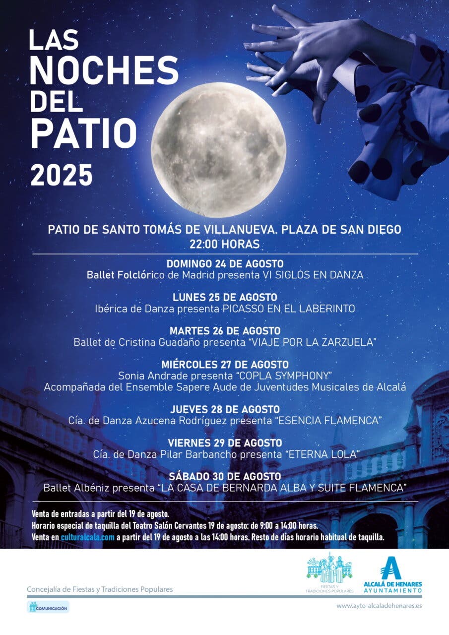 El Patio de Santo Tomás de Villanueva volverá a acoger las Noches del Patio durante las Ferias y Fiestas 2025 de Alcalá de Henares. Este ciclo, que combina música y danza y cuenta con gran respaldo del público, se desarrollará del domingo 24 al sábado 30 de agosto.