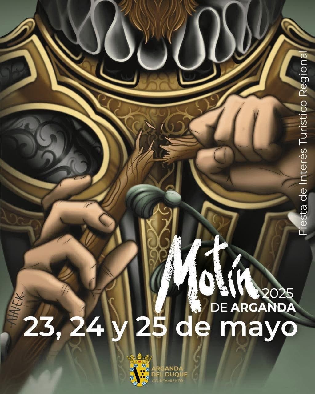 El cartel de esta edición ha sido presentado por la artista argandeña Ainek. Su diseño pone imagen a una de las celebraciones más singulares del calendario cultural de la Comunidad de Madrid. Con esta declaración de Interés Turístico Regional, el Motín de Arganda alcanza un nuevo nivel de reconocimiento institucional.