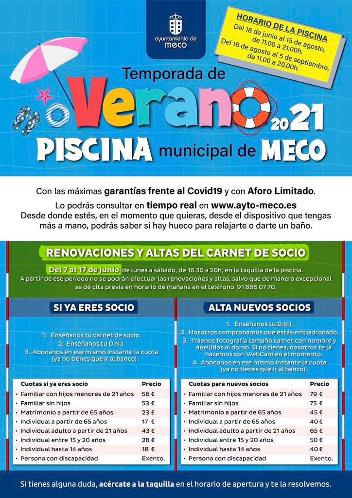 La localidad de Meco también se prepara para la apertura de su piscina de verano del 18 de junio al 5 de septiembre con horario del 18 de junio al 15 de agosto de 11:00 a 21:00 horas y del 16 de agosto al 5 de septiembre de 11:00 a 20:00 horas. En este caso también se han establecido medidas de seguridad e higiene y el aforo es limitado, y se podrá consultar en la web municipal. Del 7 al 17 de junio se realizarán las renovaciones y altas del carnet de socio.