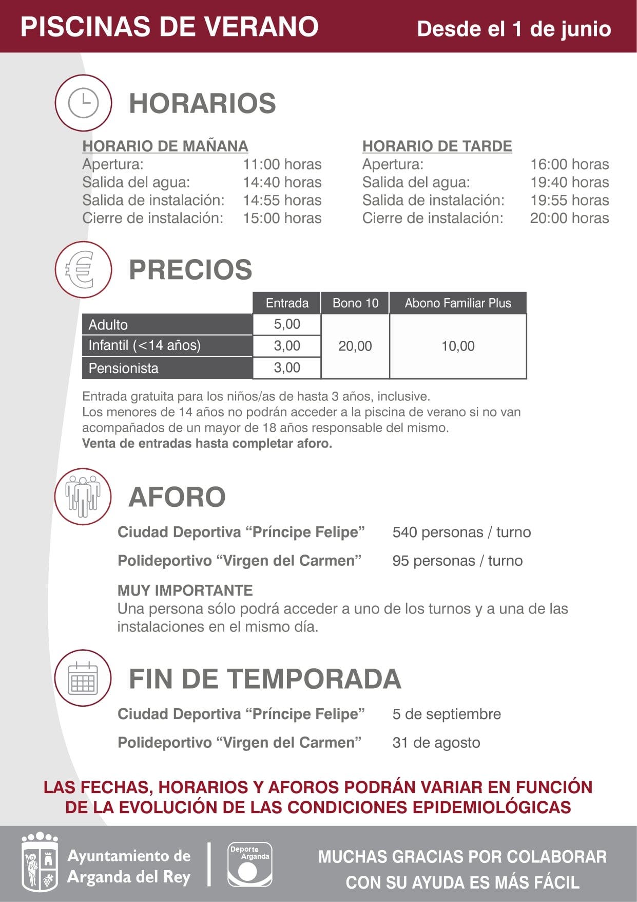 Las entradas individuales tienen un precio de 5 euros en el caso de los adultos, y 3 euros para los menores de 14 años y los pensionistas. Los niños y niñas hasta 3 años, inclusive, tienen entrada gratuita. Además, existen bonos de 10 baños a un precio de 20 euros. Los menores de 14 años no podrán acceder a la piscina de verano si no van acompañados de un mayor de edad, responsable de los mismos. La venta de entradas se realizará hasta completar aforo.