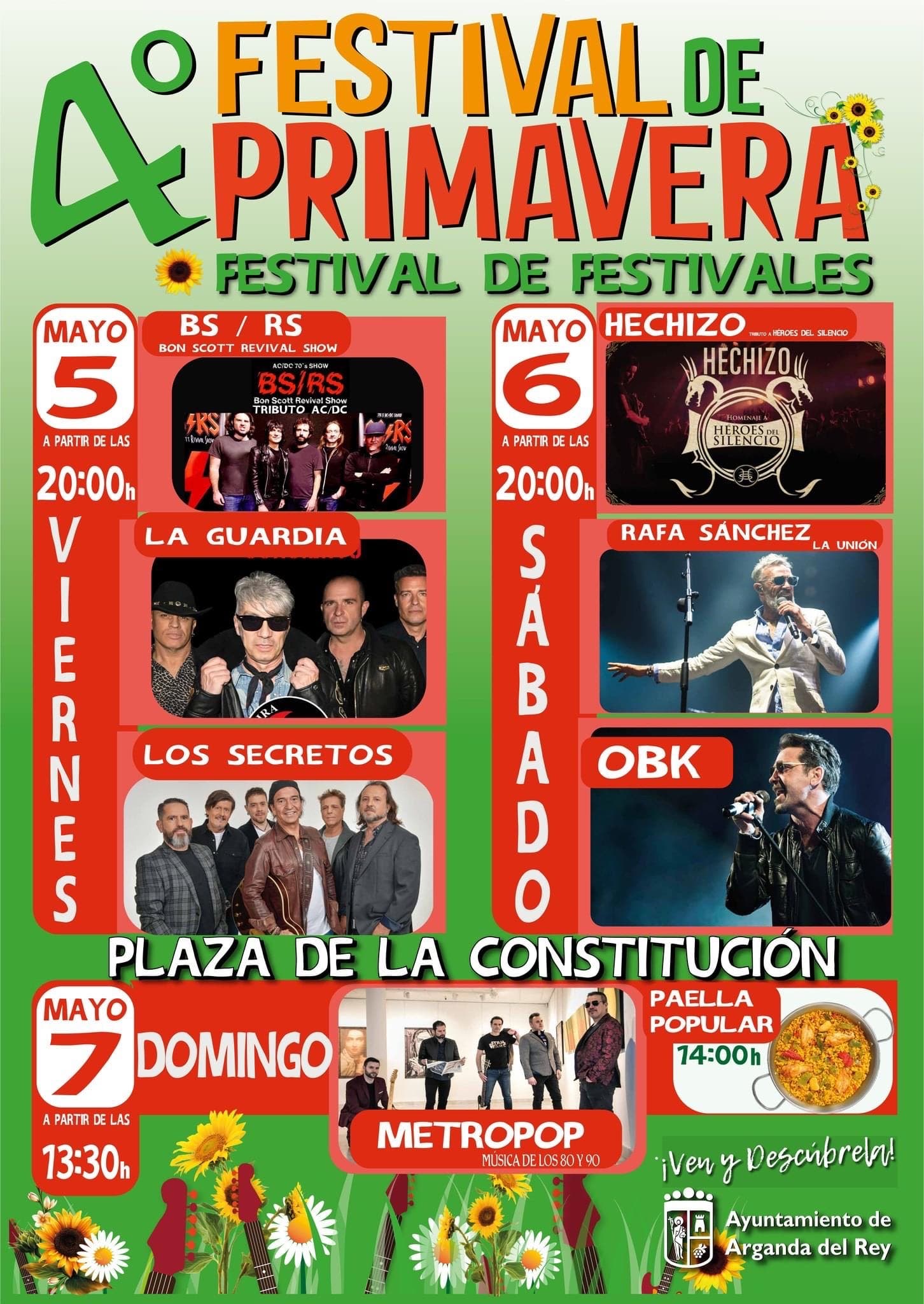 Los próximos días 5, 6 y 7 de mayo tendrá lugar el IV Festival de Primavera, organizado por el Ayuntamiento de Arganda del Rey, a través de su Concejalía de Turismo, que volverá a constar de tres jornadas de conciertos con entrada libre de reconocidos grupos musicales españoles.