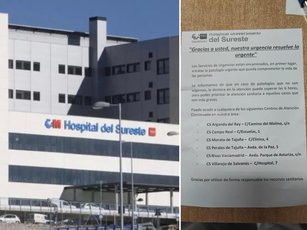 La Dirección del Hospital del Sureste, en Arganda del Rey, ha repartido una octavilla informativa a los ciudadanos que llegan al Servicio de Urgencias en las que les informan de que en caso de patologías que no son urgentes «la demora en la atención puede superar las 6 horas», según denuncia el sindicato Comisiones Obreras.