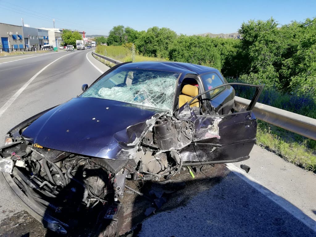 El coche ha quedado bastante destrozado tras el siniestro, que ha obligado a desviar el tráfico por la vía de servicio hasta la limpieza de la calzada.