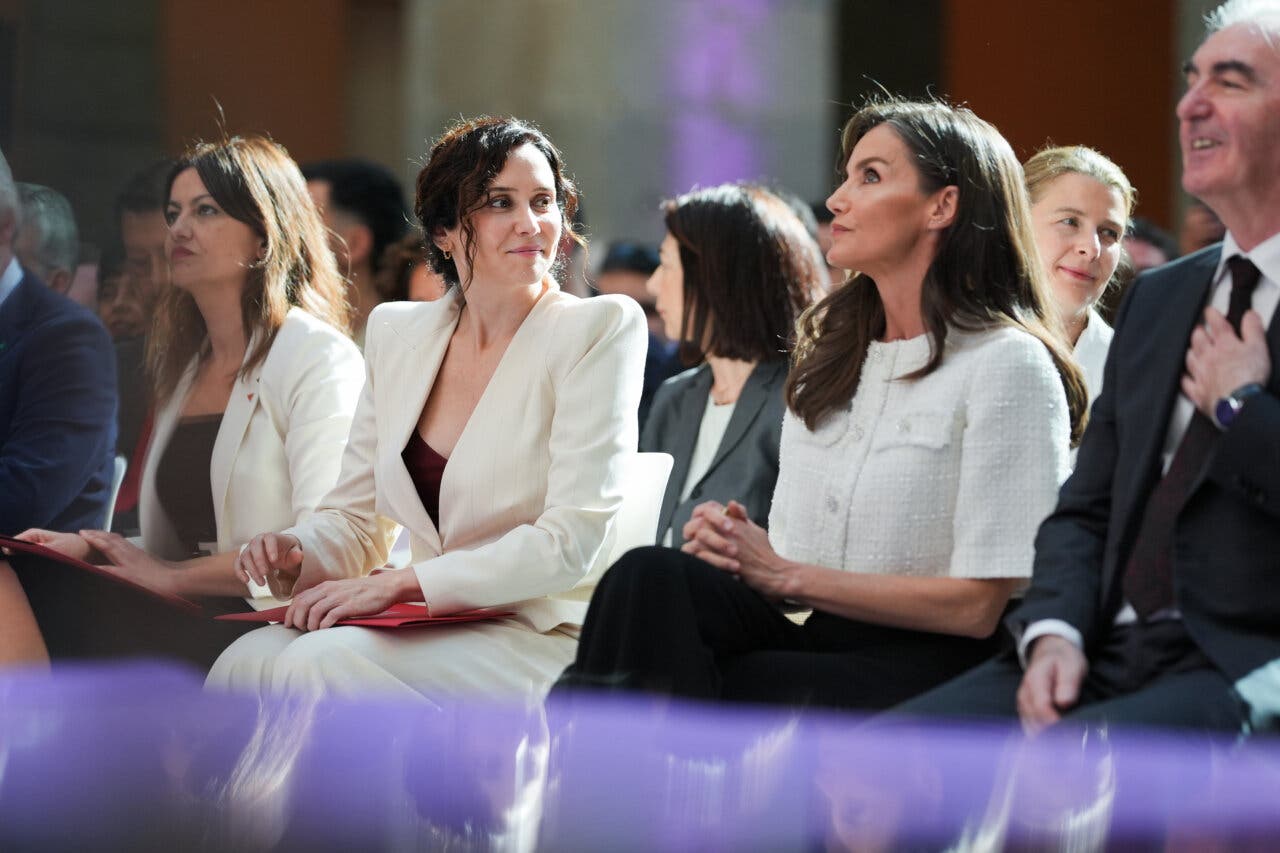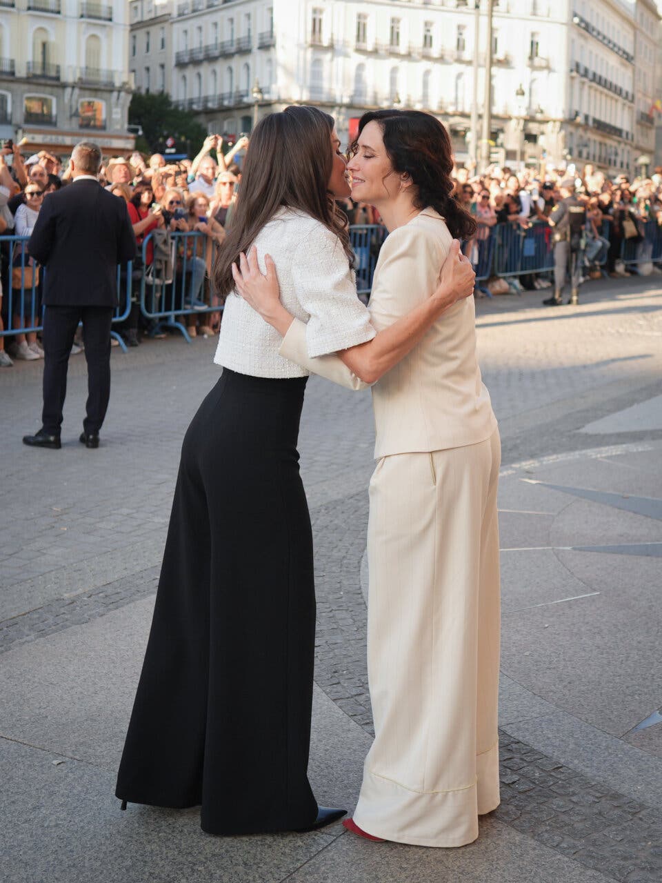 A su llegada, la Reina ha sido recibida por la presidenta de la Comunidad de Madrid, Isabel Díaz Ayuso, con quien ha compartido protagonismo tanto en el exterior como durante el acto, en una imagen de cercanía que contrasta con los rumores de tensión entre ambas en el pasado. Juntas han dedicado unos instantes a saludar a los ciudadanos que se habían congregado en la plaza.