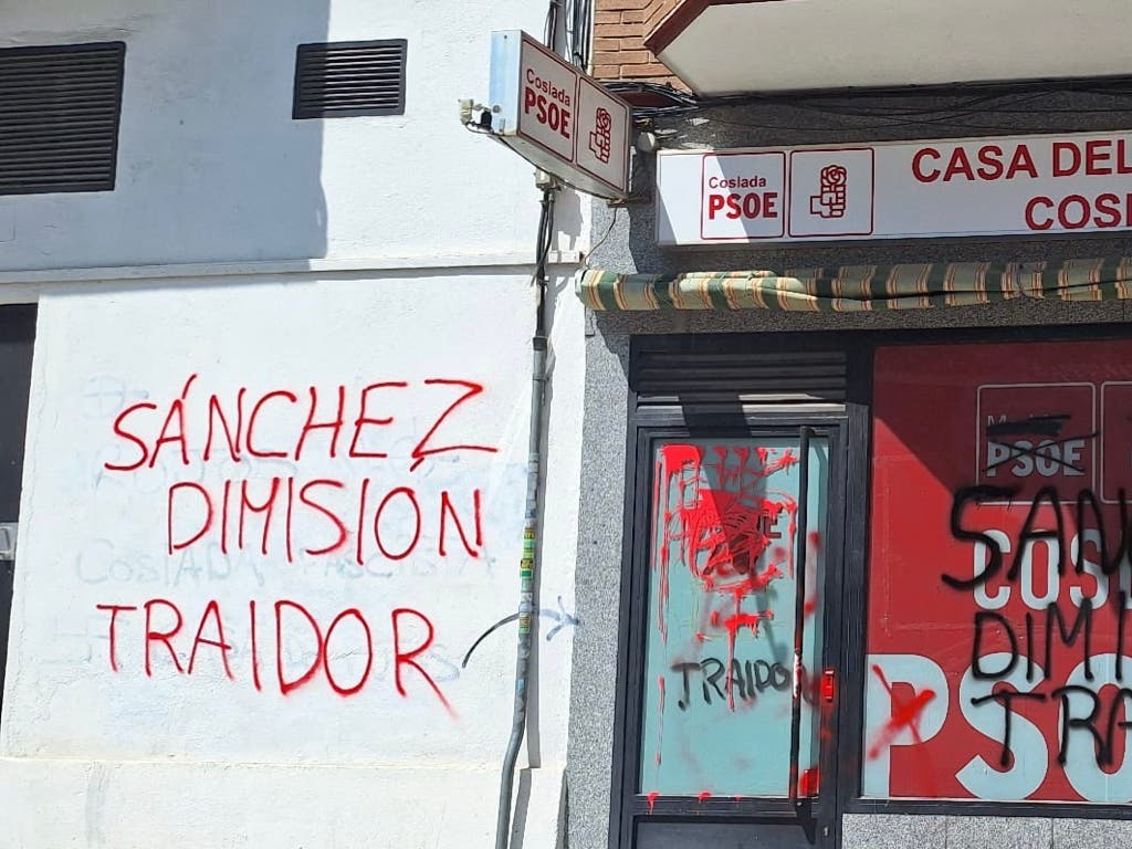 La sede del PSOE de Coslada ha vuelto a ser objeto de un acto de vandalismo. En la fachada de la Casa del Pueblo han aparecido pintadas con mensajes como «Sánchez, dimisión» y «traidores», según ha denunciado el partido en una nota de prensa.
