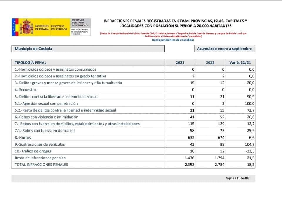 El portavoz del PP de Coslada, Paco Becerra, ha alertado del aumento de los delitos en la localidad en 2022 con respecto a 2021 (de enero a septiembre), especialmente los relacionados con la libertad sexual y los robos con fuerza y con violencia, así como las sustracciones de vehículos, según los datos publicados por el Ministerio del Interior. Unas cifras que para el portavoz popular son «absolutamente inaceptables».