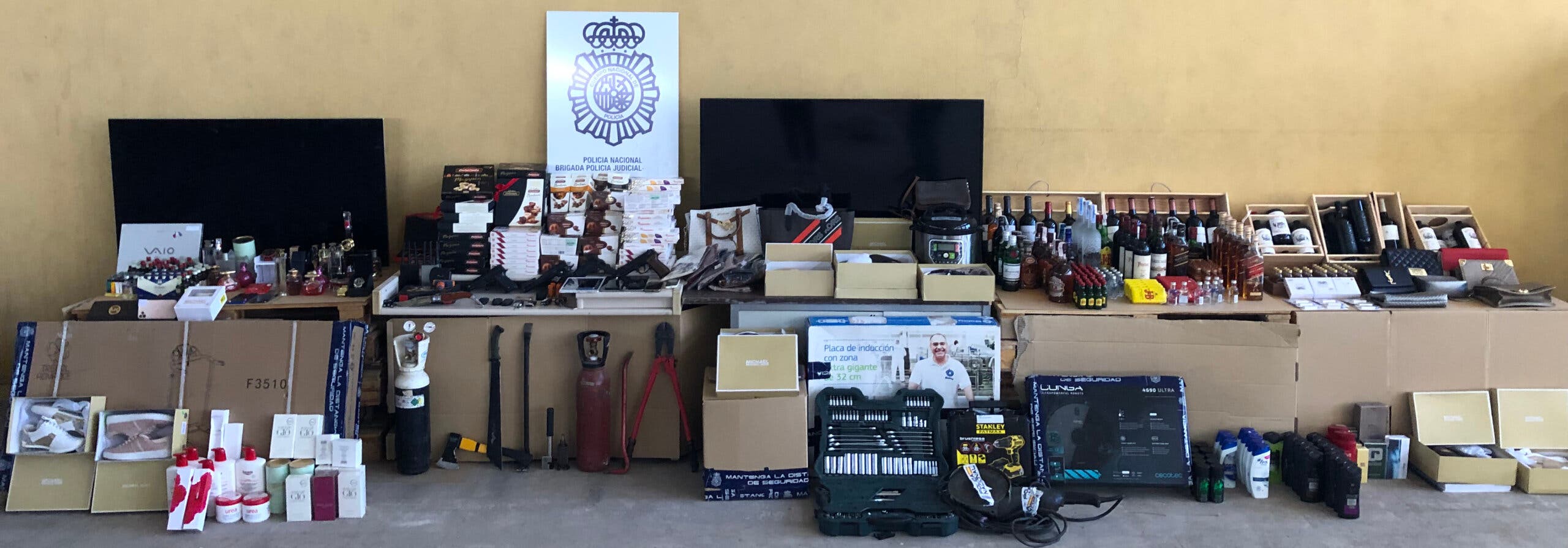 Más de 200 policías participaron en los 11 registros efectuados en la Comunidad de Madrid, donde intervinieron 20.000 euros en efectivo, varios vehículos, productos alimentarios – turrones, bebidas alcohólicas-, perfumes, 300 billetes de lotería de Navidad, relojes y bolsos de marcas de prestigio, barras de aluminio valoradas en 400.000 euros y tres plantaciones de marihuana, entre otros efectos como inhibidores de frecuencias y maquinaria para realizar llaves falsas.