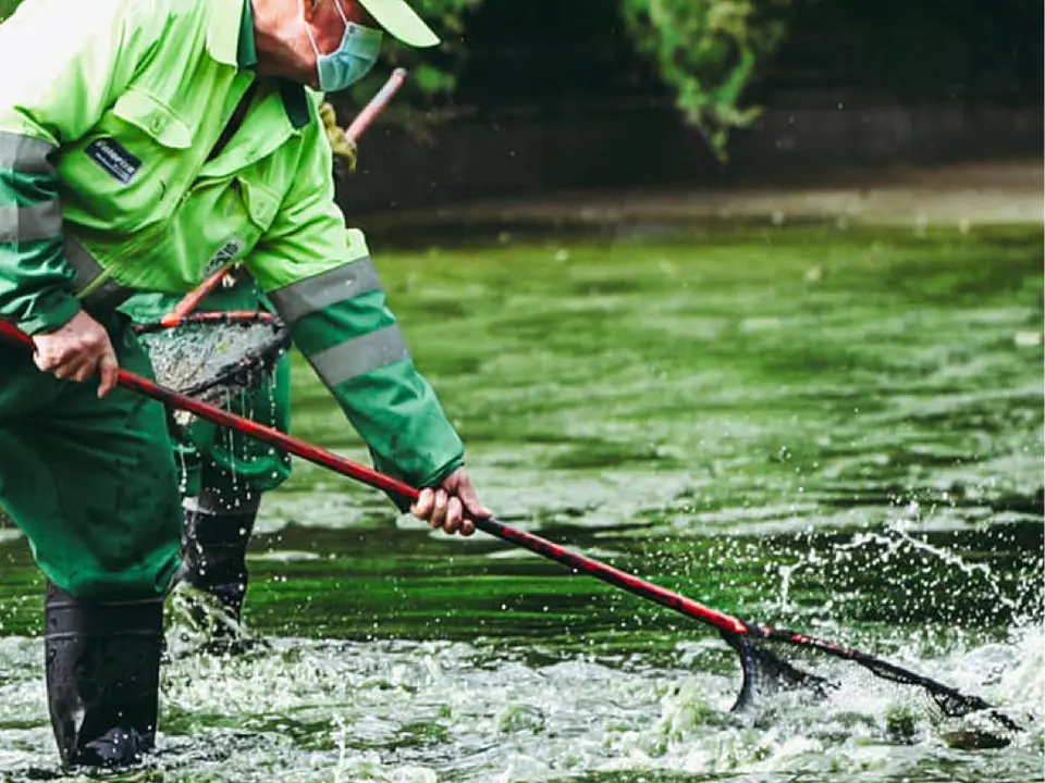 Tras el vaciado de la mayor parte del agua, se capturan los peces y se procede a la limpieza del agua para poder devolverlos.