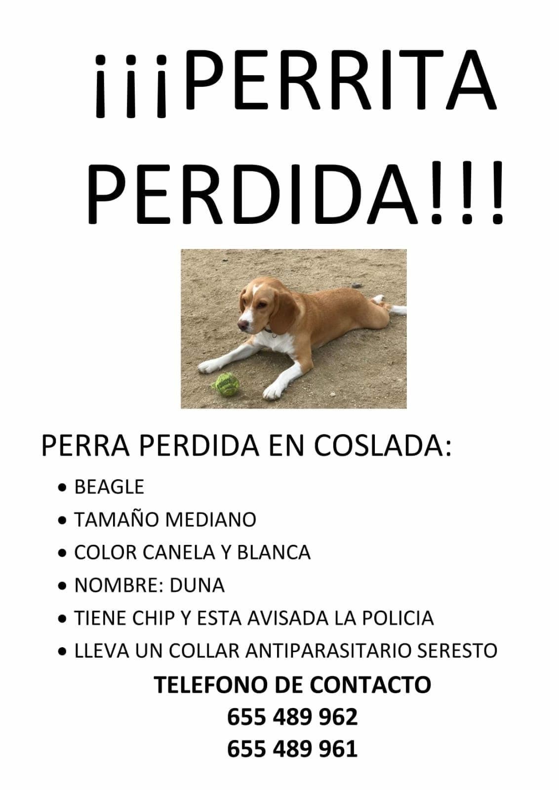 La colaboración ciudadana una vez más se ha puesto en marcha en la localidad de Coslada, en esta ocasión para encontrar a Duna, una perrita de raza beagle, de tamaño mediano, color canela y blanco, que acaba de cumplir dos años.