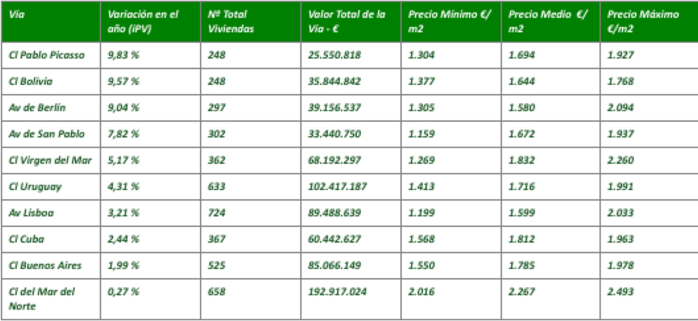 Por otra parte, la subida de precio más destacada de las principales vías del municipio en el 2016 se habría producido en la calle Pablo Picasso, cuyas 248 viviendas estarían valoradas actualmente en 25.550.818 € (según precio de mercado) y donde el precio medio habría aumentado un 9,83 % situándose ahora en 1.694 €/m2, mientras el precio máximo ascendería a 1.927 €/m2.