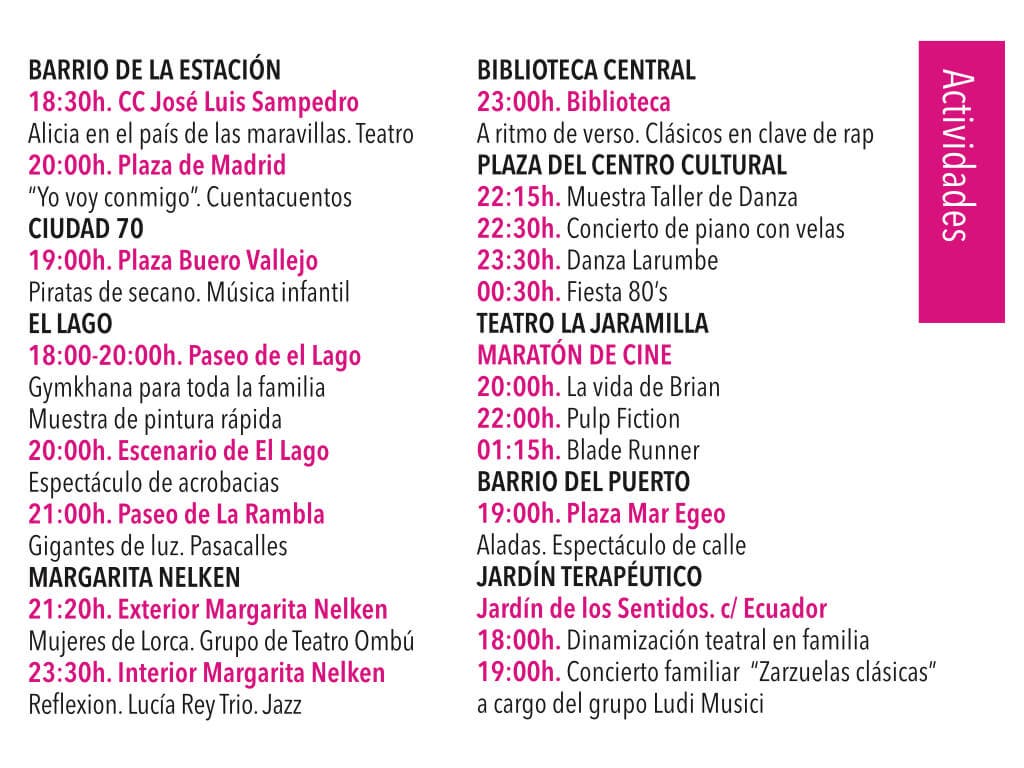 La propuesta cultural se realiza por vez primera en el municipio y consistirá en diversas actividades que comenzarán la tarde del sábado 15 de septiembre en distintas localizaciones de la ciudad, y finalizará con una Fiesta musical de los años 80-90 en la Plaza del Nuevo Centro Cultural.
