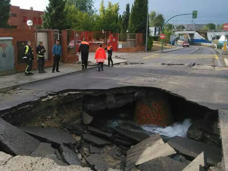 En Arganda del Rey, también se pudo ver un enorme socavón en el Paseo de la Estación de la localidad, que puso en peligro a algunos coches que había aparcados en la calle.
