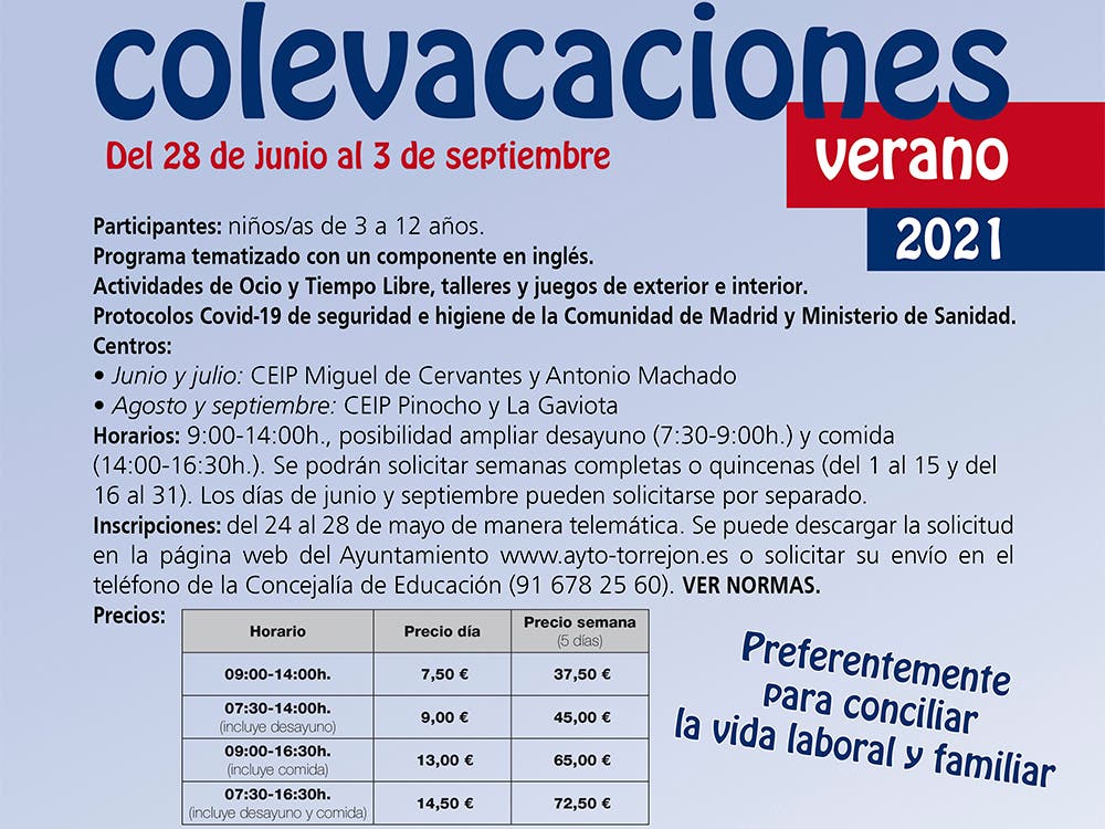 Los horarios serán de 9:00 a 14:00 horas, con posibilidad de ampliar a desayuno (7:30 a 9:00 horas) y comida (14:00 a 16:30 horas). Se podrán solicitar los periodos por semanas completas o quincenas (del 1 al 15 y del 16 al 31) y los días pertenecientes a los meses de junio y septiembre pueden solicitarse como periodos separados, aunque no sean una semana completa. En este sentido, los padres pueden dejar a sus hijos en este programa, pagando desde 7,50 euros al día. Un precio que oscila si se solicita el servicio de desayuno, el de comida o ambos. Las inscripciones se podrán realizar del 24 al 28 de mayo próximos de manera telemática, enviando la solicitud a colevacaciones@ayto-torrejon.es, que se puede descargar en www.ayto-torrejon.es o solicitar su envío en el teléfono de la Concejalía de Educación, 91 678 25 60. DOCUMENTOS COLEVACACIONES: CONSENTIMIENTO INFORMADO, FICHA DEL PARTICIPANTE, CONDICIONES Y NORMAS.