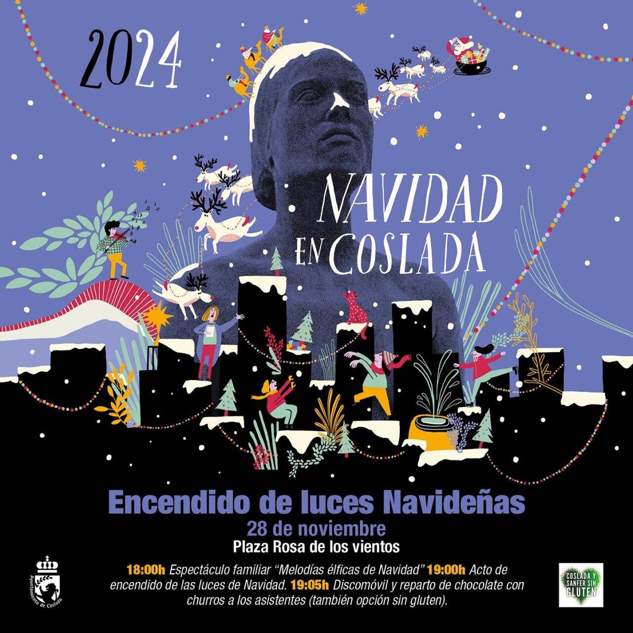 El acto de encendido comenzará a las 19:00 horas. Después habrá discomóvil y chocolate con churros (también sin gluten). Y, antes, a las 18:00, se podrá disfrutar del espectáculo Melodías élficas de Navidad.